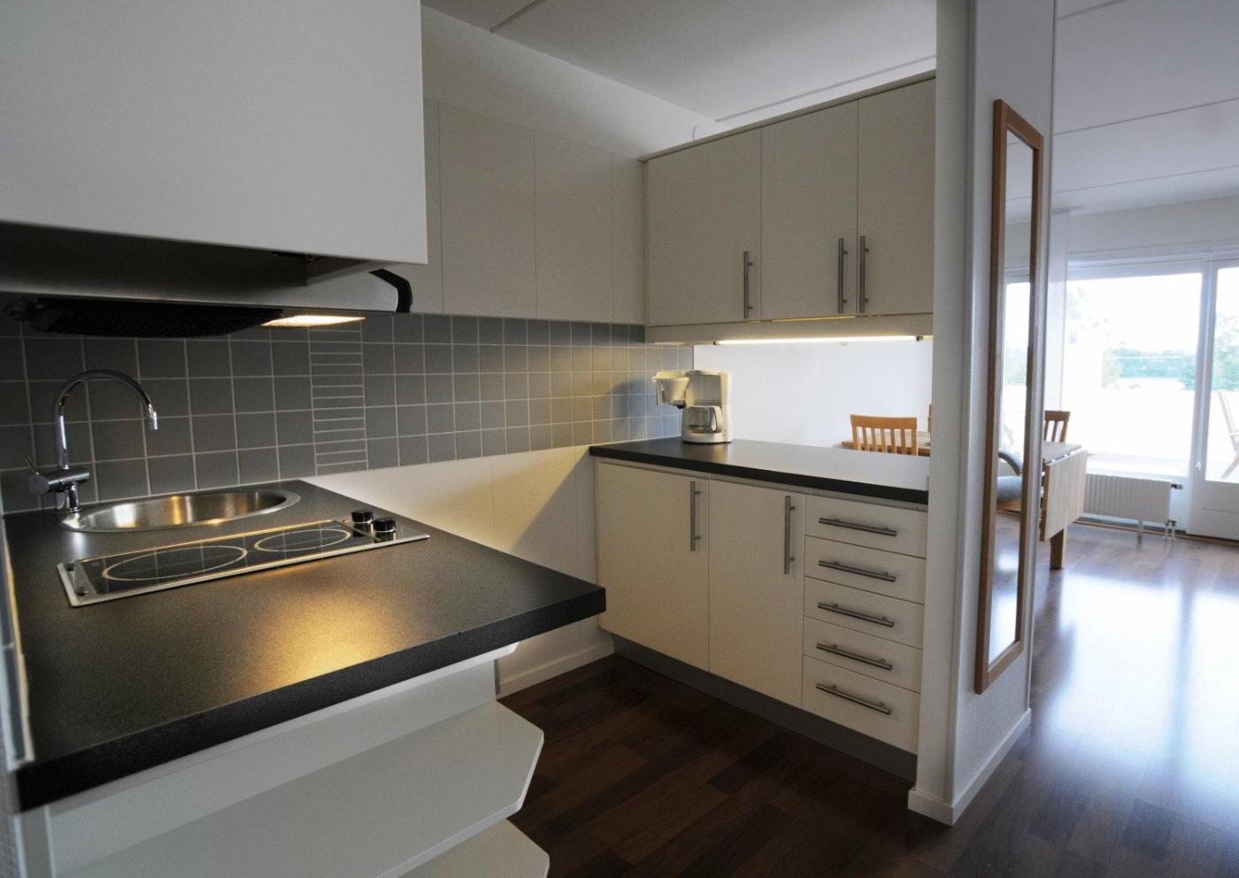 Two-Bedroom Apartment. Basic apartment that includes a furnished patio, kitchenette with a fridge and teacoffee facilities, as well as a seating area with a flat-screen TV. ;