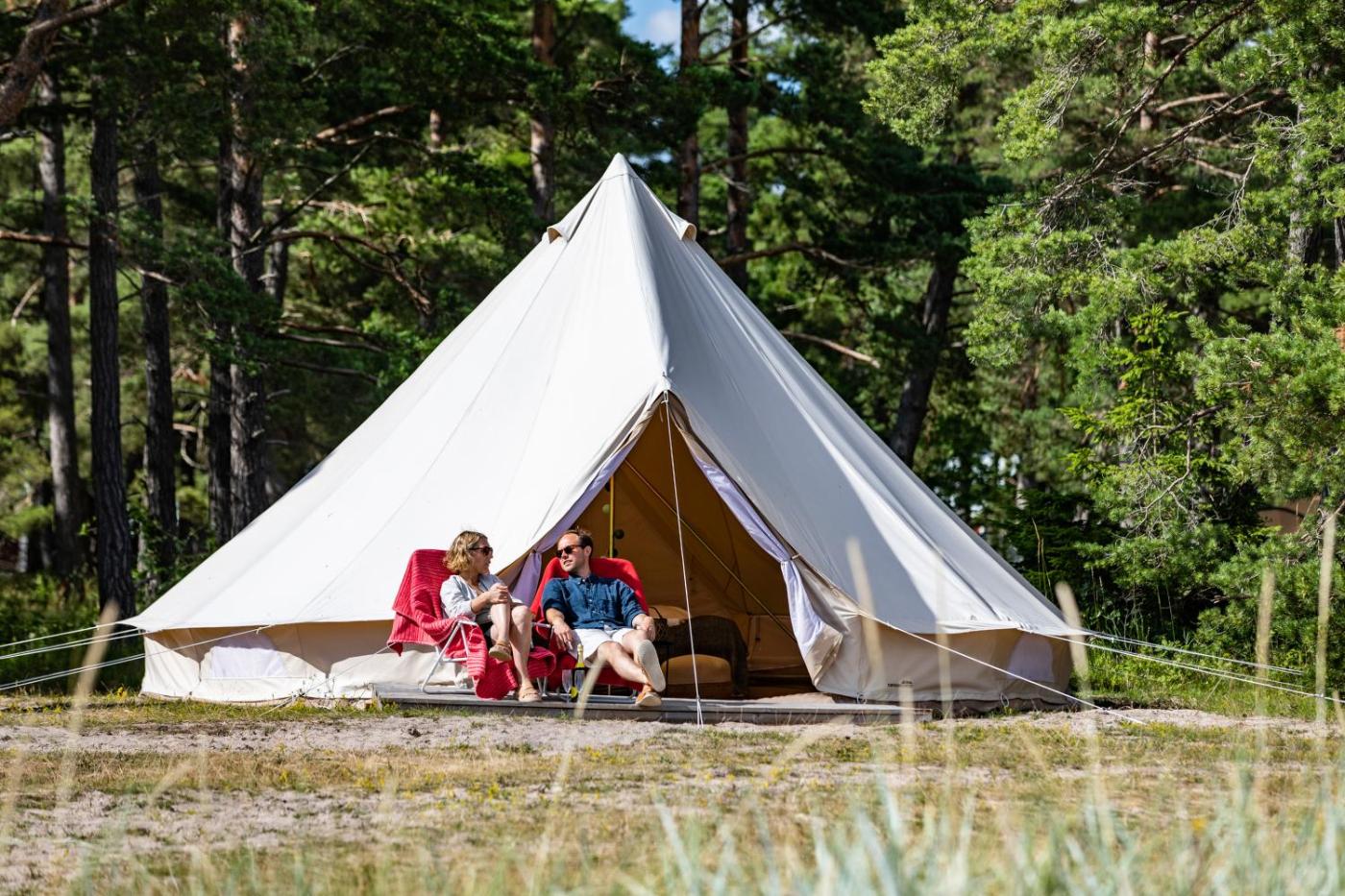 Tent. This water and windproof tent is located 50 metres from the beach and features four single beds of 80 cm as well as windows with mosquito nets. Bathroom facilities are located nearby. Bed linen and towels and breakfast are not included. Guests can bring their own or rent on site for SEK 200 per person. ;