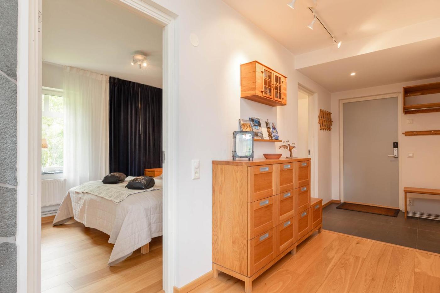 Three-Bedroom Apartment. This apartments special feature is the sauna. Featuring a private entrance, this spacious apartment also consists of 1 living room, 3 separate bedrooms and 2 bathrooms with a walk-in shower. In the well-equipped kitchen, guests will find a stovetop, a refrigerator, a dishwasher and kitchenware. Boasting a balcony with lake views, this apartment also provides a washing machine and a flat-screen TV with cable channels. The unit offers 6 beds.