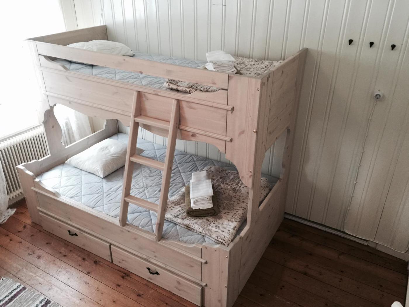 Quadruple Room with Shared Bathroom #5. Featuring scenic nature views over the Fuluälven stream, this room includes wooden floors and shared bathroom facilities. This room features 3 bunk beds that are 80 cm wide, while 1 bottom bunk bed is 120 cm wide. ;